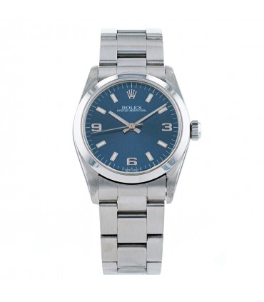 Montre bracelet de femme en acier, cadran bleu rayonnant avec chiffres arabes et index appliqués. Mouvement automatique. Bracelet acier, maillons oyster avec boucle déployante réglable en acier. Signée et numérotée.
