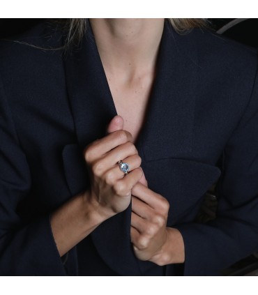 Bague en or blanc petit modèle, centré d’un motif articulé retenant une topaze bleue facettée en serti clos. Signée et numérotée.