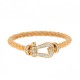 Bracelet grand modèle composé d’un câble en corderie beige torsadée agrémenté d’un fermoir en or jaune ajouré stylisant une manille rehaussée d’un pavage de diamants. Signé et numéroté.