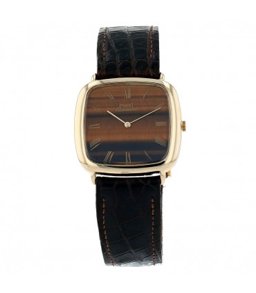 Montre bracelet en or jaune, cadran en oeil de tigre avec chiffres romains peints. Mouvement automatique. Bracelet crocodile marron avec boucle ardillon en or jaune. Signée et numérotée.