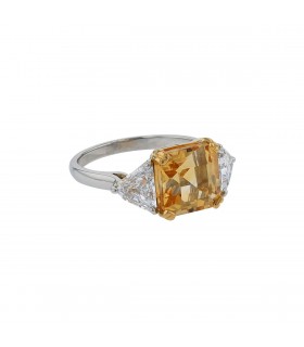 Bague en or et platine, ornée d’une citrine carrée facettée de 3,63 cts épaulée de diamants triangles.