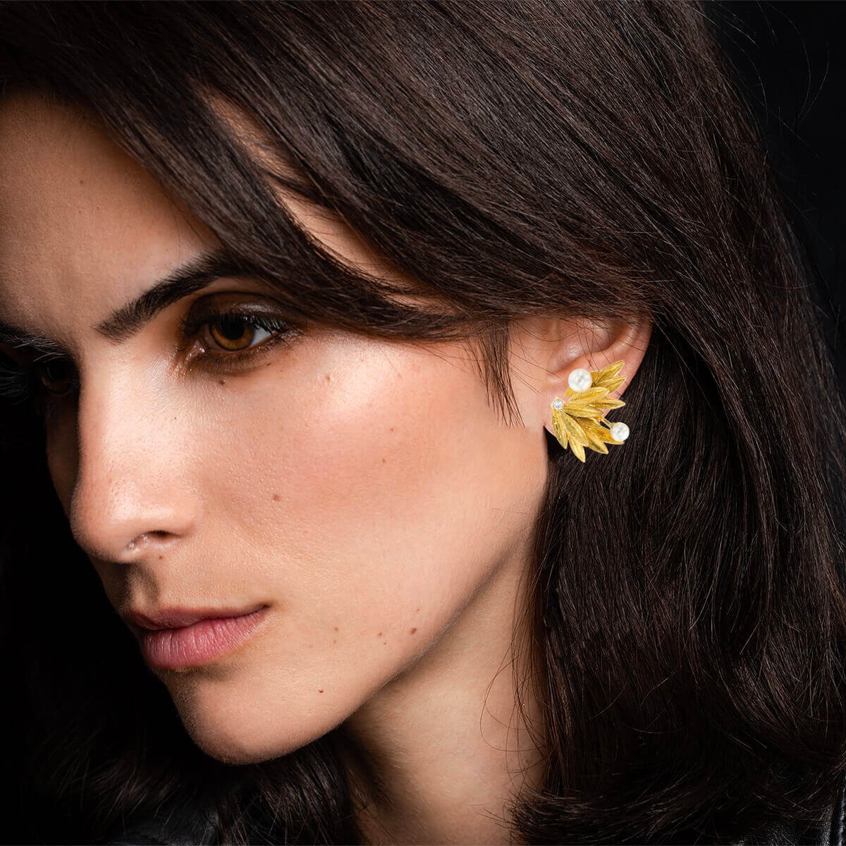 Boucles d’oreilles en or jaune, stylisant un motif feuillagé, ponctué d’un diamant et de perles de culture.