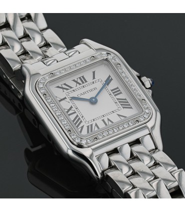 Montre bracelet de femme moyen modèle en acier, cadran argenté avec chiffres romains, chemin de fer pour les minutes, lunette ornée de diamants. Mouvement quartz. Bracelet acier, maillons articulés avec boucle déployante en acier. Signée et numérotée.