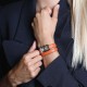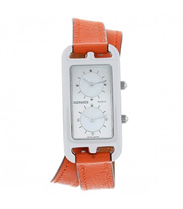 Montre bracelet de femme en acier, cadran à double fuseau horaire argenté avec index, lunette stylisée. Mouvement quartz. Bracelet en cuir orange avec boucle ardillon en acier. Signée et numérotée.