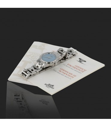 Montre bracelet de femme en acier, cadran bleu ciel rayonnant, lunette ponctuée de diamants. Mouvement quartz. Bracelet en acier, maillons ajourés à décor de “H” avec boucle déployante en acier. Signée et numérotée.