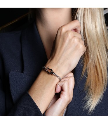 Bracelet grand modèle composé d’une maille ovale ajourée en or blanc, agrémenté d’un fermoir en or rose ajouré stylisant une manille. Signé et numéroté.