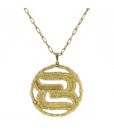 Chaîne en or jaune, composée de maillons ovales lisses et torsadés, retenant un important pendentif rond ajouré martelé à décor géométrique abstrait.