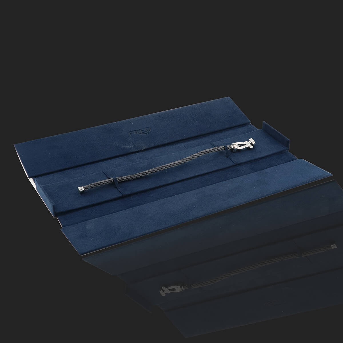 Bracelet grand modèle composé d’un câble gris torsadé agrémenté d’un fermoir en or blanc ajouré stylisant une manille. Signé et numéroté.