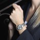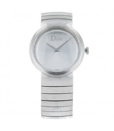 Montre bracelet en acier, cadran argenté quadrillé rayonnant, lunette stylisée. Mouvement quartz. Bracelet acier, maillons articulés avec boucle déployante en acier. Signée et numérotée.