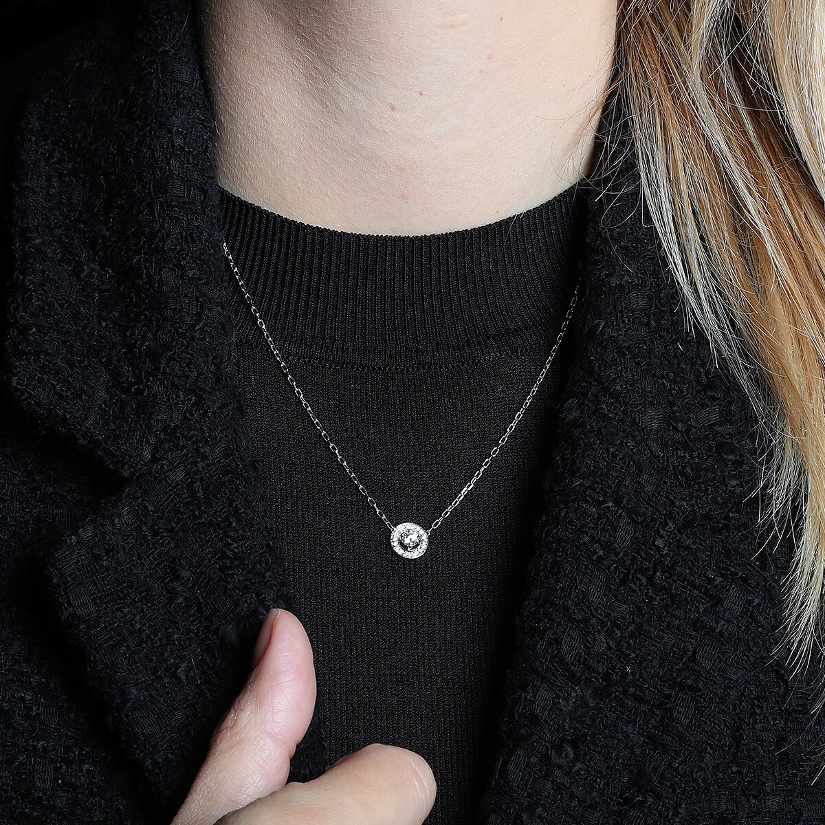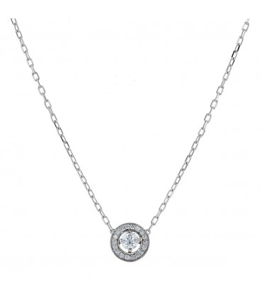 Collier en or blanc, maille forçat, centré d’un motif rond ajouré orné d’un diamant de 0,22 ct env. dans un entourage de diamants. Signé et numéroté.