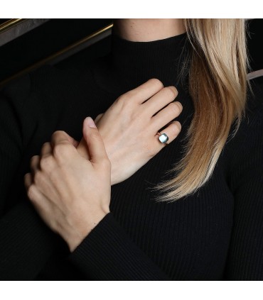 Bague 2 tons d’or rose et blanc, ornée d’une topaze bleue facettée. Signée et numérotée.