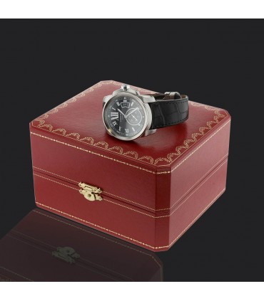 Montre bracelet d’homme en acier, cadran noir avec chiffres romains et chemin de fer pour les minutes, petite trotteuse à 6 heures, affichage de la date par guichet à 3 heures. Fond de boîte transparent dévoilant son mouvement automatique. Bracelet crocodile noir usagé avec boucle déployante réglable en acier. Signée et numérotée.