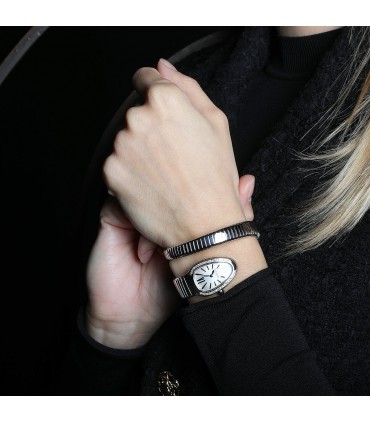Montre bracelet de femme en acier, cadran argenté stylisé avec chiffres romains et index appliqués, lunette ornée de diamants. Mouvement quartz. Bracelet en acier, maille tubogas. Signée et numérotée
