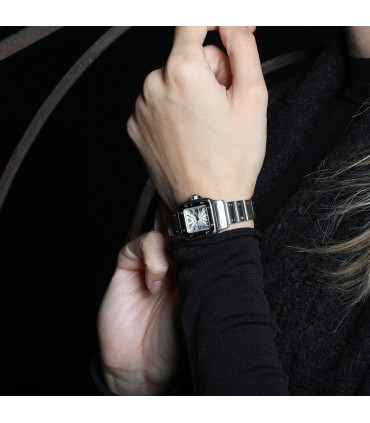 Montre bracelet de femme en acier, cadran argenté rayonnant avec chiffres romains peints, chemin de fer pour les minutes, affichage de la date par guichet à 4 heures 30, lunette à décor de vis. Mouvement automatique. Bracelet en acier, maillons articulés avec boucle déployante en acier. Signée et numérotée.