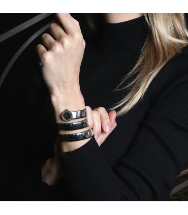 Montre bracelet de femme en acier, cadran noir avec chiffres arabes et index appliqués, lunette gravée Bvlgari. Mouvement quartz. Bracelet flexible 3 rangs ouvert en acier, maille Tubogas. Signée et numérotée.