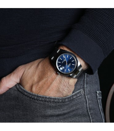 Montre bracelet en acier, cadran bleu rayonnant avec index appliqués, chemin de fer pour les minutes, affichage de la date par guichet à 3 heures. Mouvement automatique. Bracelet acier, maillons oyster avec boucle déployante réglable en acier. Signée et numérotée réf. 126300.