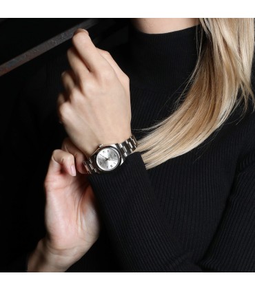 Montre bracelet de femme en acier, cadran argenté rayonnant avec chiffres arabes et index bâtons appliqués roses. Mouvement automatique. Bracelet acier, maillons oyster avec boucle déployante réglable en acier. Signée et numérotée réf. 177200.