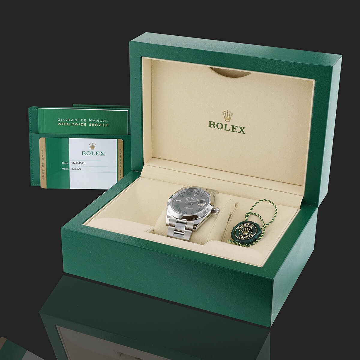 Montre bracelet d’homme en acier, cadran gris rayonnant avec chiffres romains de couleur verte, affichage de la date par guichet à 3 heures, chemin de fer pour les minutes. Mouvement automatique. Bracelet acier, maillons oyster avec boucle déployante réglable en acier. Signée et numérotée réf. 126300.