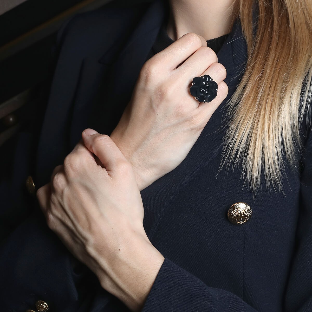 Bague moyen modèle en or blanc, ornée d’un onyx sculptée à décor de camélia. Signée et numérotée.