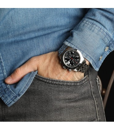 Montre chronographe en acier, cadran noir 3 compteurs avec chiffres arabes, affichage de la date par guichet à 3 heures, lunette graduée d'un tachymètre jusqu'à 500 units par heures. Mouvement automatique. Bracelet acier, maillons oyster avec boucle déployante réglable en acier. Signée et numérotée ref. 79280.