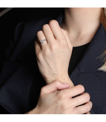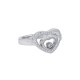 Bague en or blanc, stylisant un coeur ajouré composé d’une ligne de diamants entrelaçant un second coeur ajouré retenant un diamant mobile en serti clos. Signée et numérotée.