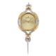 Montre bracelet de femme 2 tons d’or, cadran doré patiné, lunette stylisée partiellement ornée de diamants taille 8/8. Mouvement mécanique. Bracelet fil en or blanc rigide ouvrant. Signée.