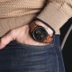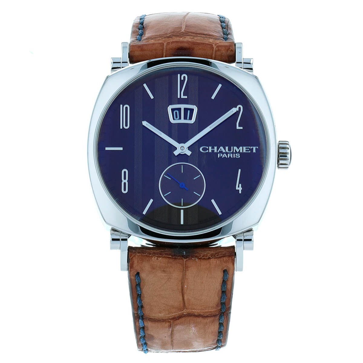 Montre bracelet d'homme en acier, cadran à rayures bayadères marrons avec chiffres arabes et index appliqués, affichage de la date par guichet à 12 heures, petite trotteuse à 6 heures. Mouvement automatique. Bracelet crocodile usagé marron à surpiqûres bleues avec boucle déployante réglable en acier. Signée et numérotée.