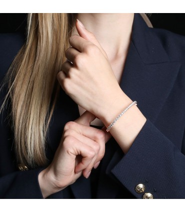 Bracelet jonc rigide ouvrant en or rose, rehaussé d’une ligne de diamants en serti griffe, agrémenté d’un fermoir à cliquet avec sécurité.
