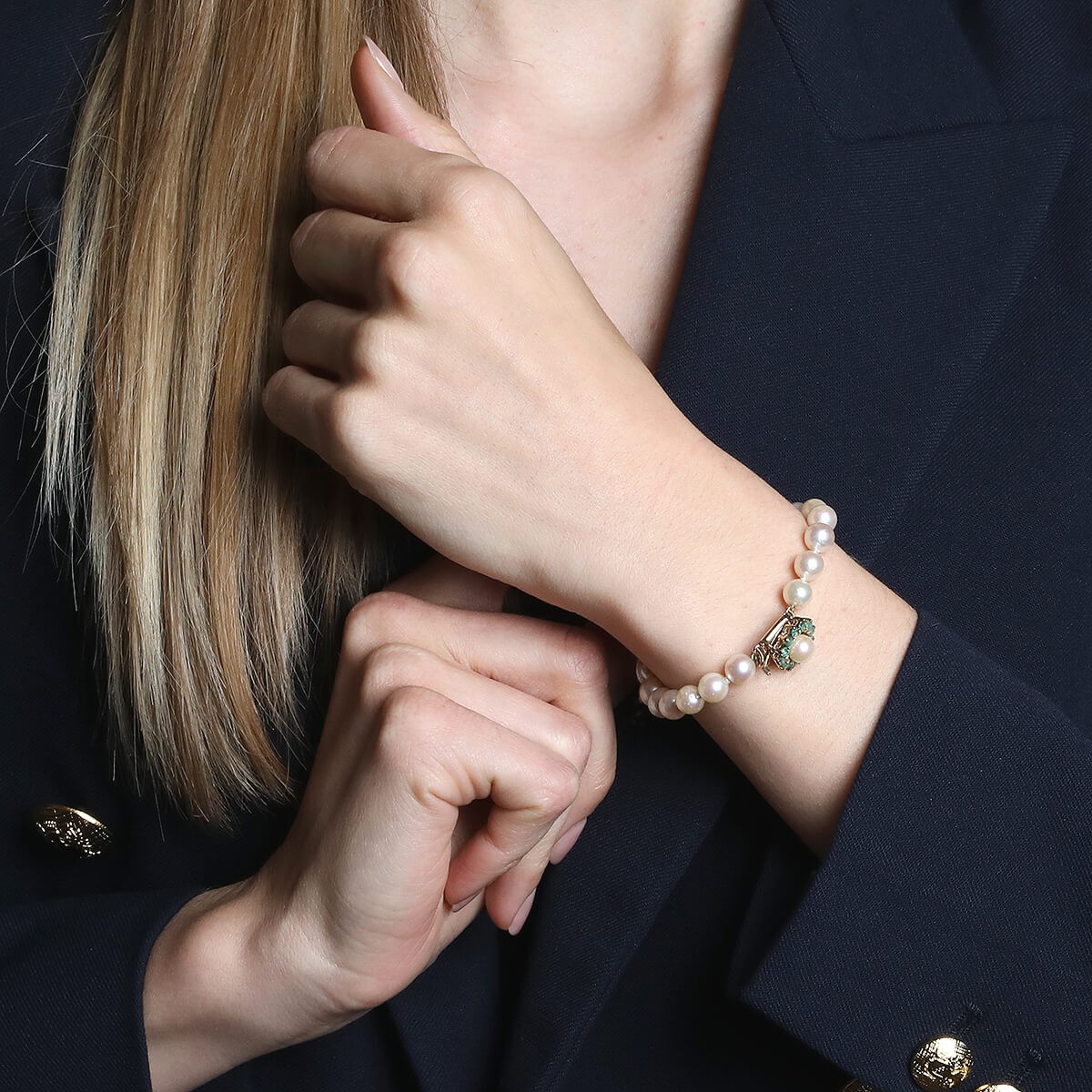 Bracelet composé d’un rang de perles de culture de 7 mm de diamètre, agrémenté d’un fermoir à cliquet en or 375°/oo (9k), orné d’une perle de culture dans un entourage d’émeraudes facettées.