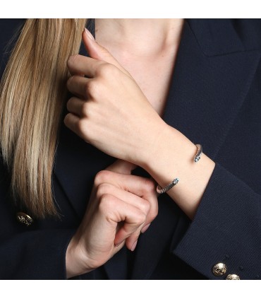 Bracelet rigide ouvert en argent, stylisant une torsade les embouts ponctués de topazes bleues facettées rehaussées de diamants. Signé.