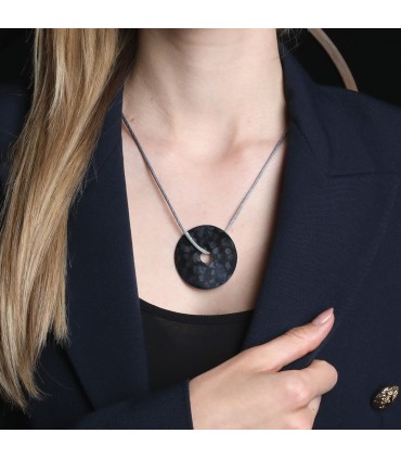 Pendentif en argent, stylisant un disque Pi chinois martelé symbolisant le ciel, l’infini et le bien-être, retenu par un cordon de soi gris. Signé.