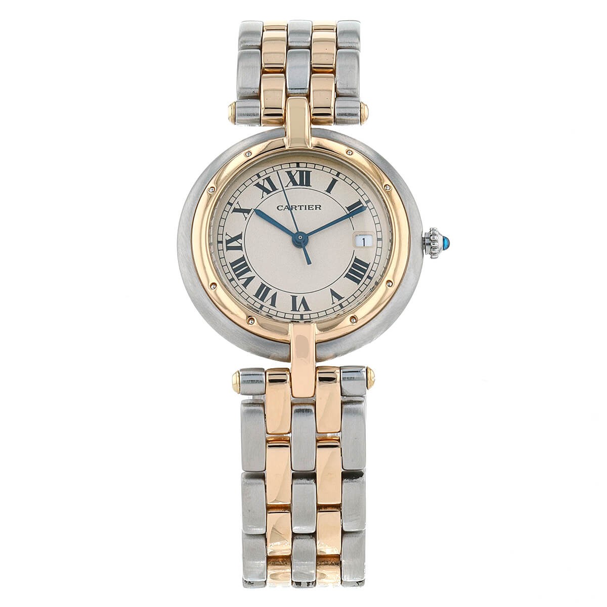 Montre bracelet de femme grand modèle en or jaune et acier, cadran crème avec chiffres romains peints, chemin de fer pour les minutes, affichage de la date par guichet à 3 heures, lunette en or jaune. Mouvement quartz. Bracelet 2 rangs en or jaune et acier, maillons articulés avec boucle déployante en acier. Signée et numérotée.