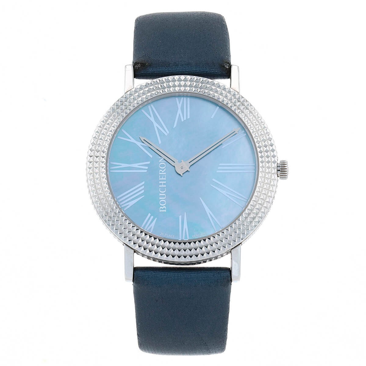 Montre bracelet en acier, cadran nacré bleu ciel avec chiffres romains, aiguille stylisant la colonne Vendôme, lunette à décor ''clous de Paris''. Mouvement quartz. Bracelet en tissu bleu gainé cuir avec boucle ardillon en acier. Signée et numérotée. Accompagnée d’un bracelet supplémentaire neuf en crocodile marron.
