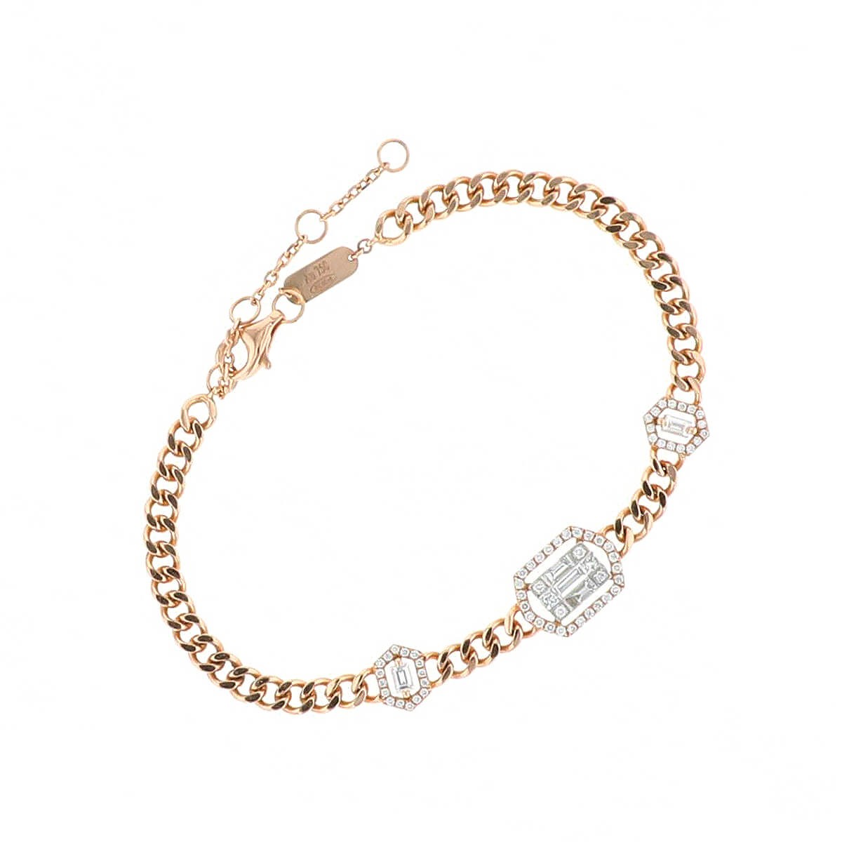 Bracelet en or rose, maille gourmette, centré de 3 motifs hexagonaux ornés de diamants ronds et baguettes, agrémenté d’un fermoir mousqueton. Signé.