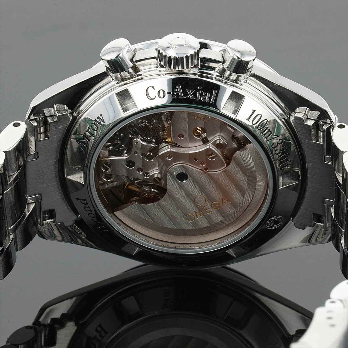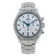 Montre chronographe en acier, cadran argenté 3 compteurs avec index appliqués, chemin de fer pour les minutes, affichage de la date par guichet à 6 heures, lunette graduée d’un tachymètre jusqu’à 1000 units par heure. Fond de boîte transparent dévoilant son mouvement automatique. Bracelet acier, maillons articulés avec boucle déployante réglable en acier. Signée et numérotée.