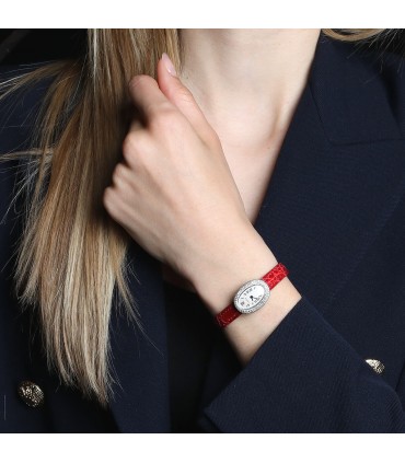 Montre bracelet de femme en or blanc, cadran crème avec chiffres romains peints, lunette galbée rehaussée d'un pavage de diamants. Mouvement quartz. Bracelet crocodile rouge avec boucle déployante en or blanc. Signée et numérotée.