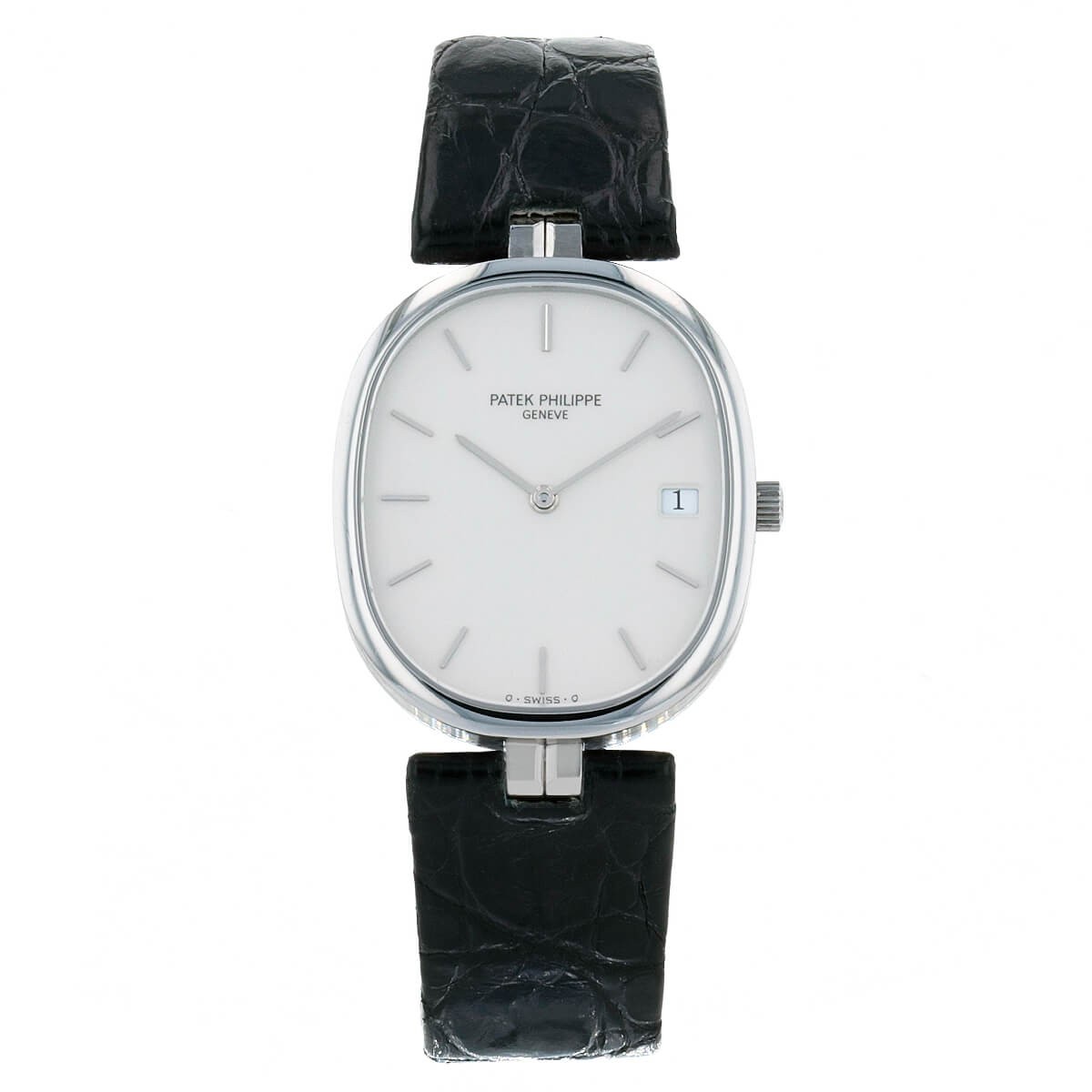 Montre bracelet en acier, cadran crème avec index appliqués. Mouvement quartz. Bracelet crocodile noir avec boucle déployante en acier. Signée et numérotée.