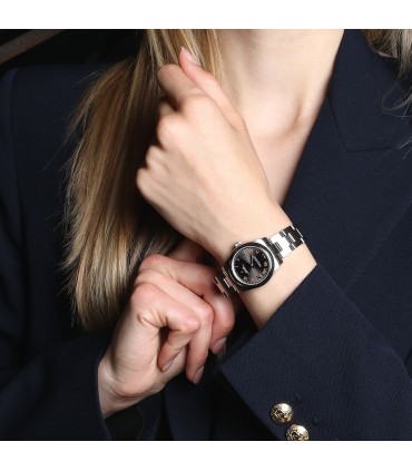 Montre bracelet de femme en acier, cadran marron rayonnant avec chiffres romains. Mouvement automatique. Bracelet acier, maillons oyster avec boucle déployante réglable en acier. Signée et numérotée réf. 177200.