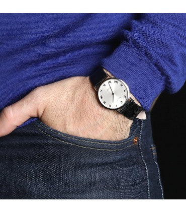 Montre bracelet en or blanc, cadran argenté rayonnant avec chiffres romains appliqués. Mouvement mécanique. Bracelet neuf en lézard noir avec boucle ardillon an acier. Signée et numérotée.