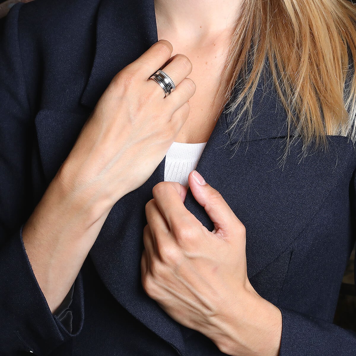 Bague en or blanc et PVD noir, stylisant 4 anneaux travaillés en relief aux motifs lisse poli, pointe de diamant et godrons. Signée et numérotée. Attention nous recommandons pour ce modèle de prévoir 2 tailles au dessus de votre taille habituelle.