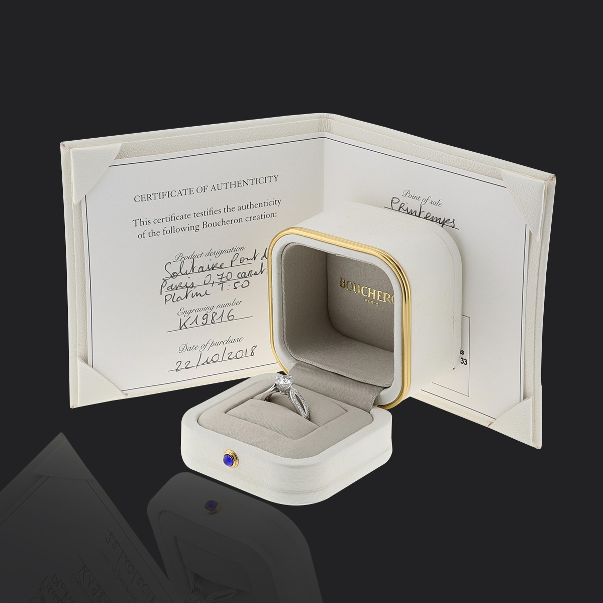 Bague solitaire en platine, ornée d’un diamant 0,70 ct en serti griffe, les palmettes diamantées. Signée et numérotée.
