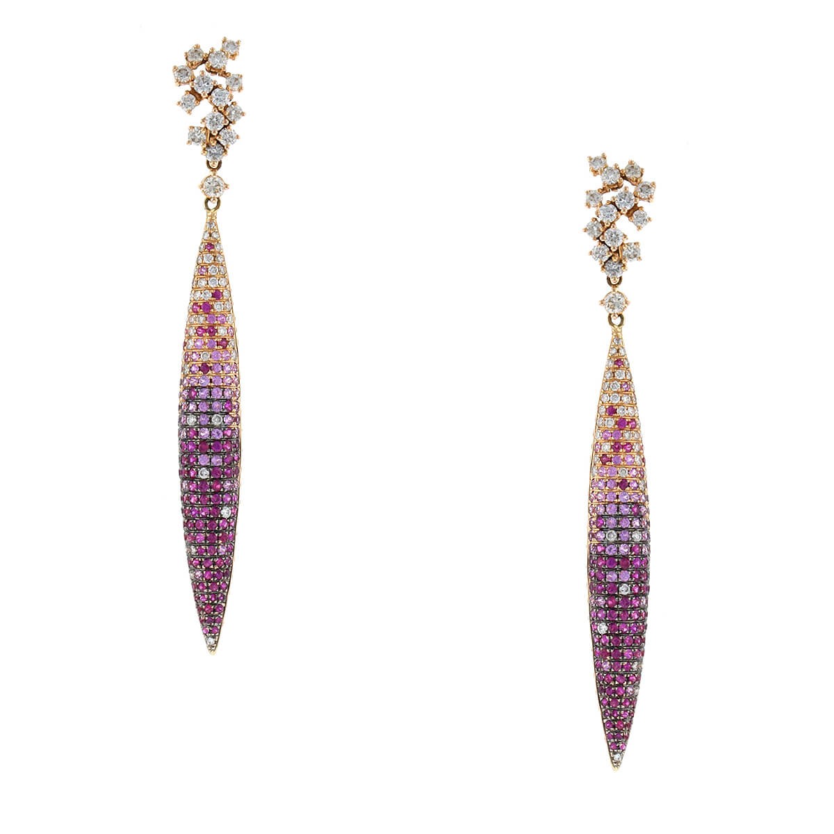 Boucles d’oreilles en or rose, ornées de diamants retenant un motif géométrique mobile rehaussé d’un pavage de diamants et camaïeu de saphirs roses.