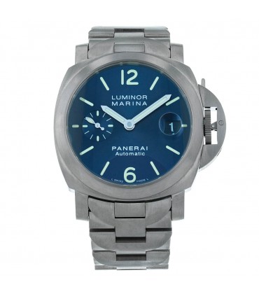 Montre bracelet d’homme en titane, cadran bleu avec chiffres arabes et index luminescents, affichage de la date par guichet à 3 heures, petite trotteuse à 9 heures. Mouvement automatique. Bracelet en titane, maillons articulés avec boucle déployante en titane. Signée et numérotée.