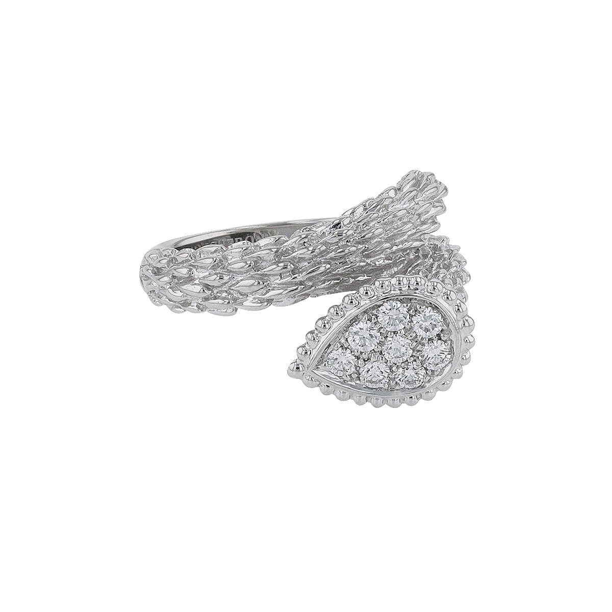 Bague en or blanc petit modèle, à décor d’écailles et d’un motif perlé en poire orné d’un pavage de diamants. Signée et numérotée.