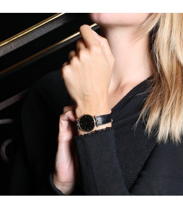 Montre bracelet de femme en or jaune, cadran noir avec chiffres romains et index peints. Mouvement quartz. Bracelet crocodile noir usagé avec boucle ardillon en métal doré. Manque à l’émail sur cadran entre 9 et 12 heures.