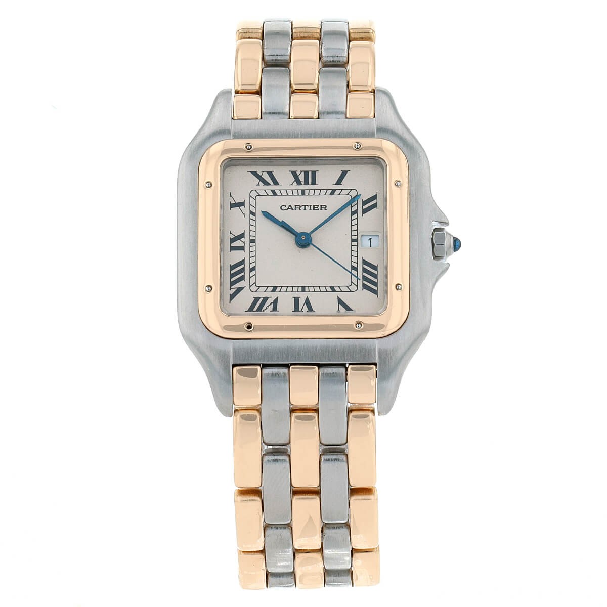Montre bracelet grand modèle en or jaune et acier, cadran argenté avec chiffres romains peints, chemin de fer pour les minutes, affichage de la date par guichet à 3 heures. Mouvement quartz. Bracelet 3 rangs d’or jaune et acier, maillons articulés avec boucle déployante en acier. Signée et numérotée.