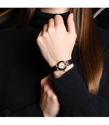 Montre bracelet de femme en or jaune, cadran argenté avec chiffres romains peints, lunette stylisée. Mouvement quartz. Bracelet rapporté en cuir noir avec boucle ardillon rapportée en métal doré. Signée et numérotée.