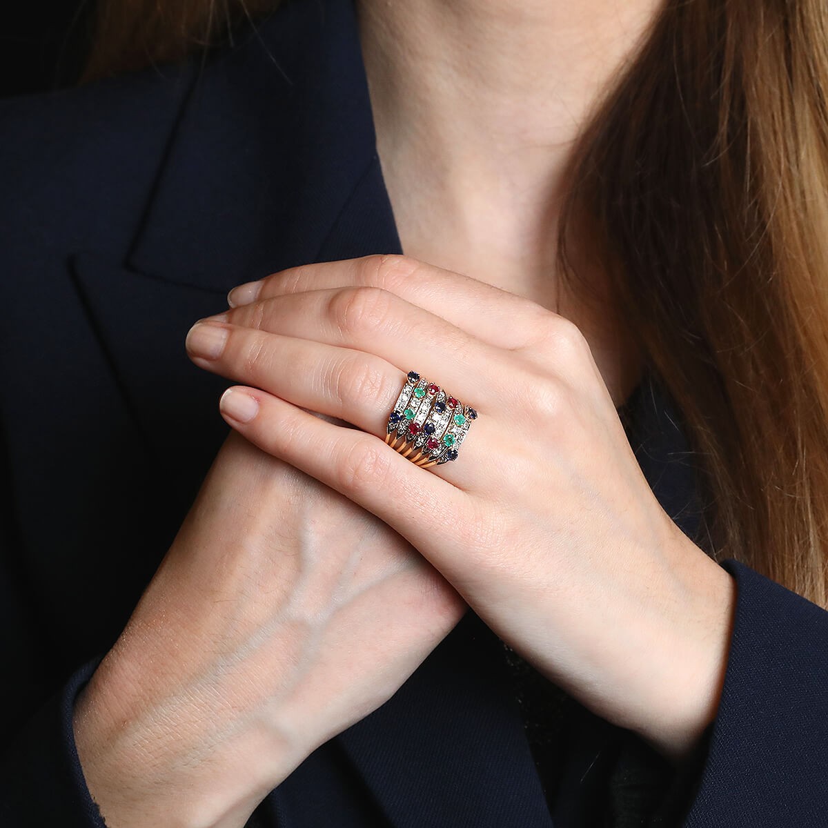 Bague en or jaune, composée de sept anneaux mobiles sertis de diamants ponctués de saphirs, rubis et émeraudes.