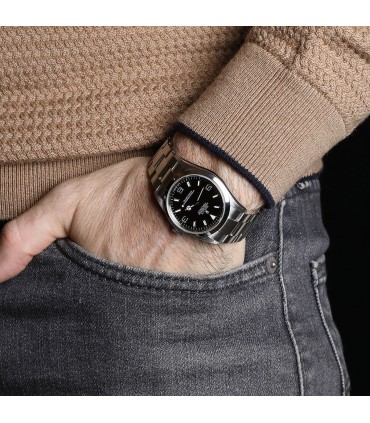 Montre bracelet en acier, cadran noir avec chiffres arabes et index appliqués luminescents. Mouvement automatique. Bracelet acier, maillons oyster avec boucle déployante réglable en acier. Signée et numérotée réf. 114270.