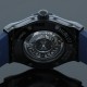 Montre bracelet d’homme en céramique noire et titane, cadran bleu rayonnant avec index appliqués, affichage de la date par guichet à 3 heures, lunette stylisée à décor de vis. Fond de boîte transparent dévoilant son mouvement automatique. Bracelet neuf en caoutchouc bleu avec boucle déployante réglable en acier. Signée et numérotée.